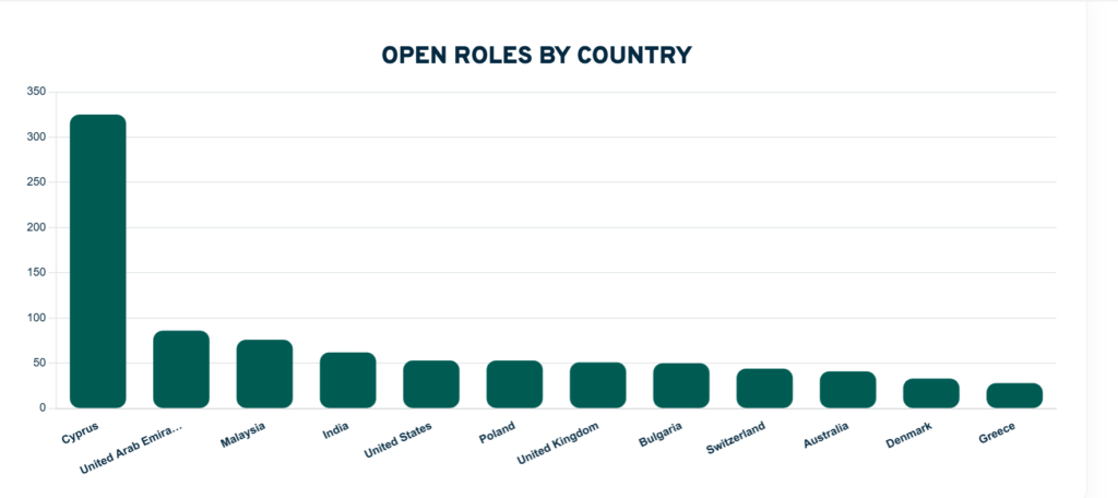 While the data was primarily sourced from openly advertised roles shared by firms on LinkedIn and other jobs boards, and so may not be fully representative of hiring activity in the broker space, it still indicates that Cyprus is far from being unseated from its key role for the industry.