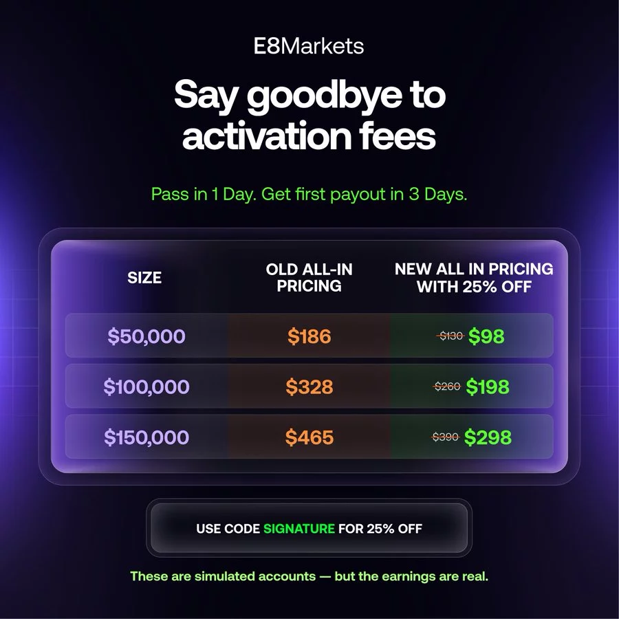 Retail prop firm E8 Markets has ditched activation fees on all its programs, including futures accounts, making them one-time fee only.
