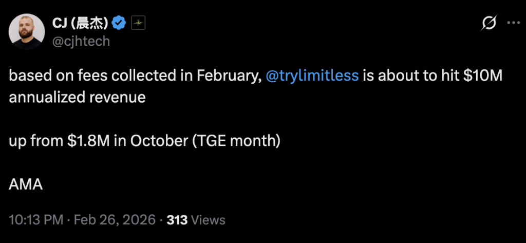 “[Based] on fees collected in February, [Limitless] is about to hit $10M annualized revenue,” said CJ Hetherington. “Up from $1.8M in October.”