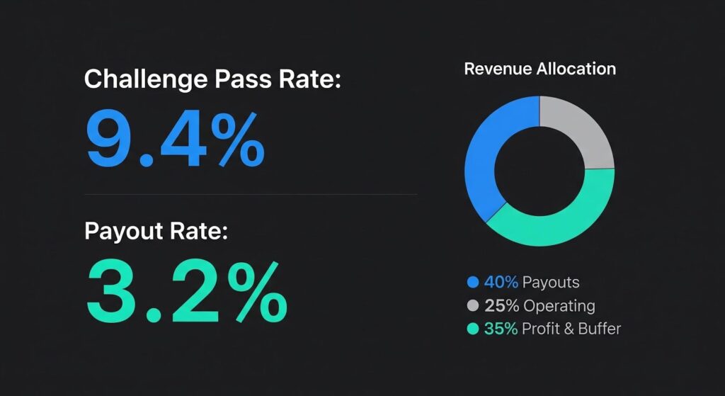 Healthy firms typically operate around 8–12% challenge pass rates, payout rates below 4%, roughly 40% of revenue to payouts, and 20–30% operating costs.