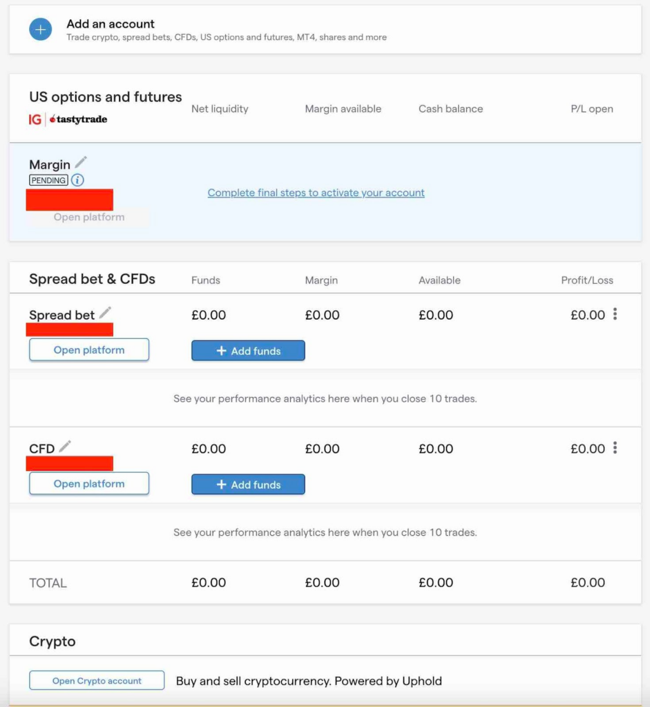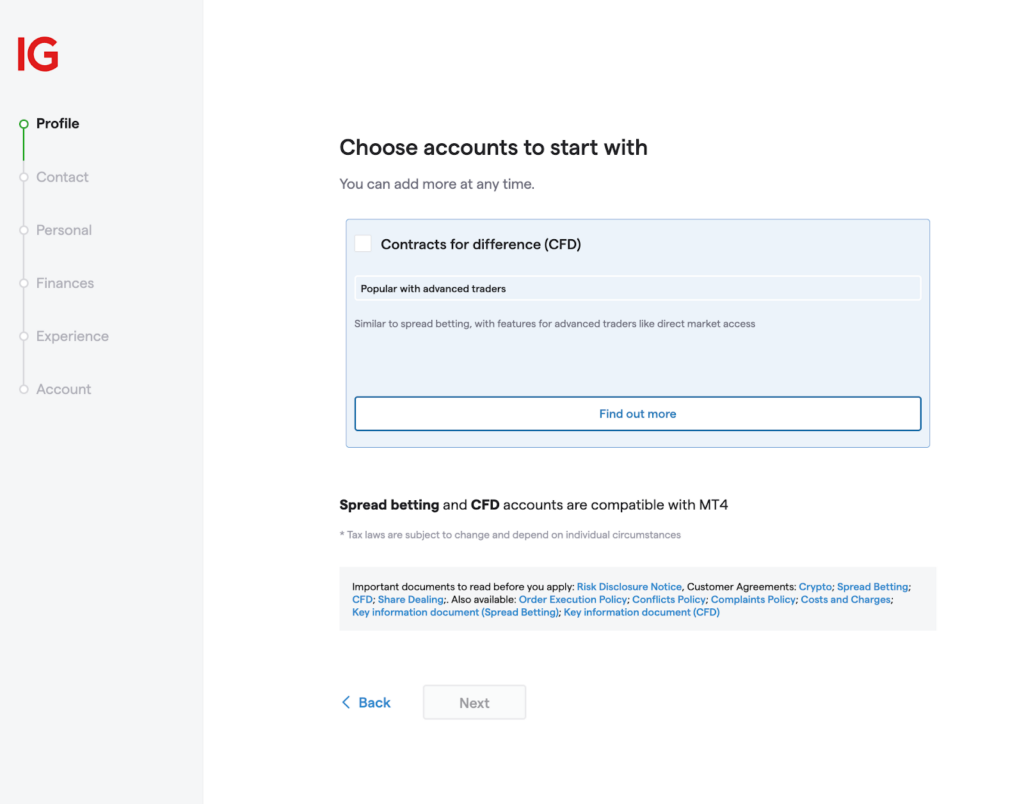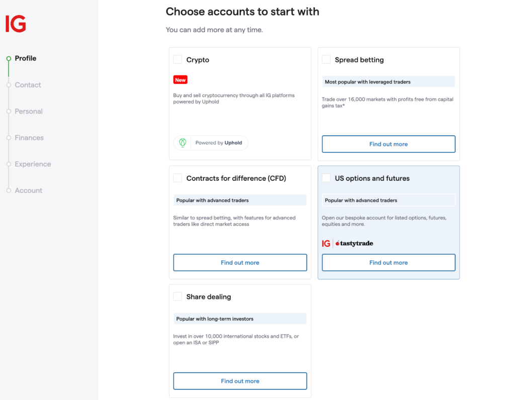 For example, if you are in the UK and sign up for a CFD trading account, IG gives you the option to also open accounts with crypto, shares, options and futures, or spread bets. You can see an example of what this looks like below in a short video.