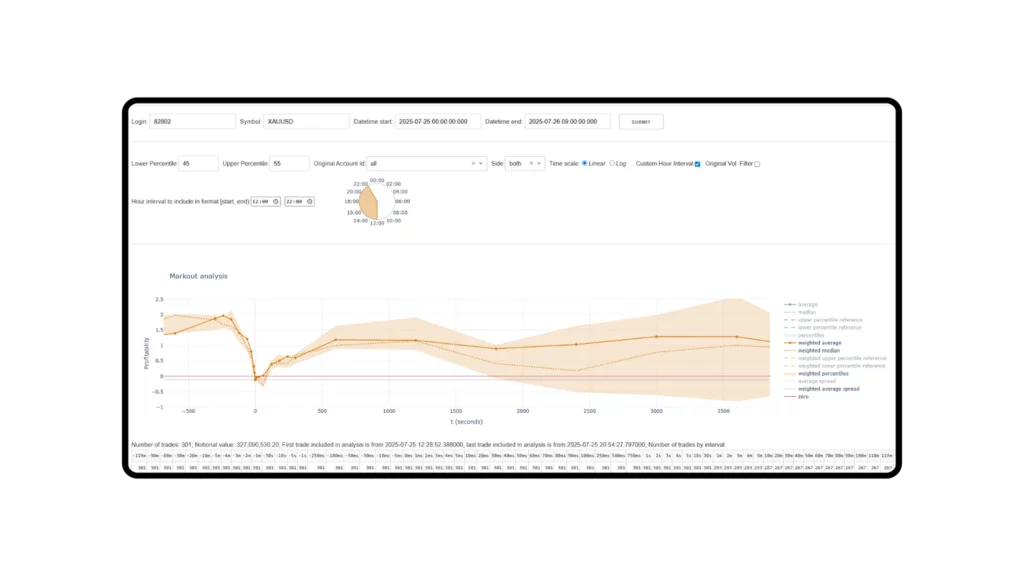 HawkEye continuously performs real-time markout calculations and spread coverage analysis over defined time frames to identify latency arbitrage. Once detected, the problematic flow is automatically shifted to dedicated liquidity pools, preserving optimal trading conditions for legitimate clients.