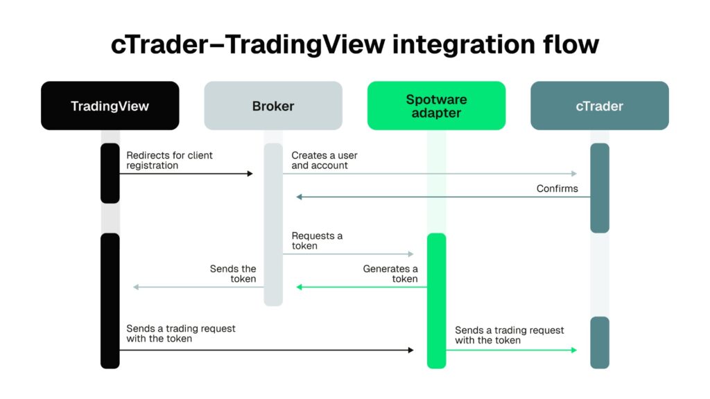The integration is enabled through a dedicated adapter developed exclusively by Spotware, ensuring a stable link between the TradingView interface and the cTrader backend. Brokers can seamlessly add an additional trading interface without altering their existing infrastructure. Spotware handles the adapter deployment and configuration, allowing orders initiated in TradingView to be processed by the cTrader backend, using the broker’s established setup, risk controls and connectivity.