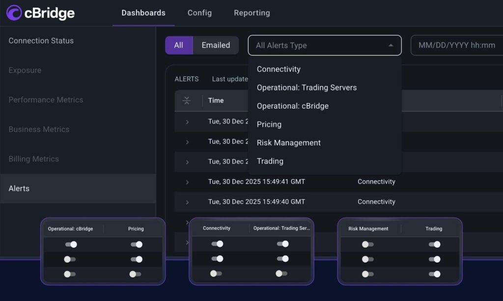 cBridge delivers role-based alerts by email and through a dedicated alert dashboard, covering both technical and operational anomalies. Email notifications include clear details on the underlying anomaly, and the dashboard extends this with filters for current alerts and full history. Alerts are grouped by function – connectivity issues, trading server events, pricing inconsistencies, execution-related signals and cBridge operational issues, ensuring each team receives what is relevant to their area.